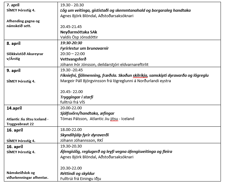 | Dyravarðarnámskeið | 07. apr. - 16. apr. | þriðjudagur, miðvikudagur og fimmtudagur | 18:00-22:00 | SÍMEY | 72.000 kr. | Skráning |